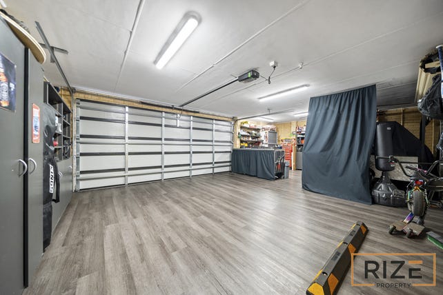 The front of the home is just as impressive, with a massive driveway that easily fits up to six cars—or a caravan—plus an extra-high, extra-wide double garage with remote access and a built-in workshop. There's even quality flooring in the garage, making it one of the best setups you'll see.