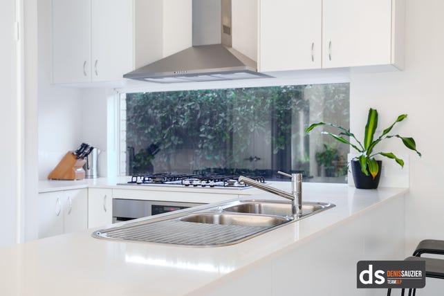The Kitchen is modern, fresh and bright with overhead cupboards, feature glass window instead of a splash back, pendant lights, stone benchtops and microwave nook. Stainless steel appliances including a 900mm cooktop, oven & range hood. Dishwasher nook below the sink.