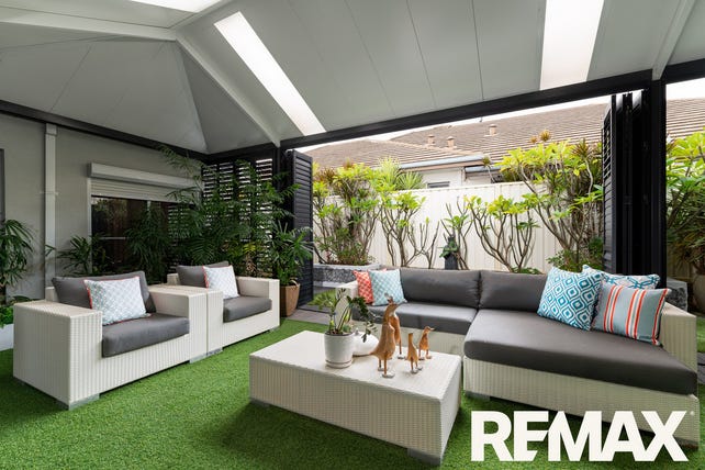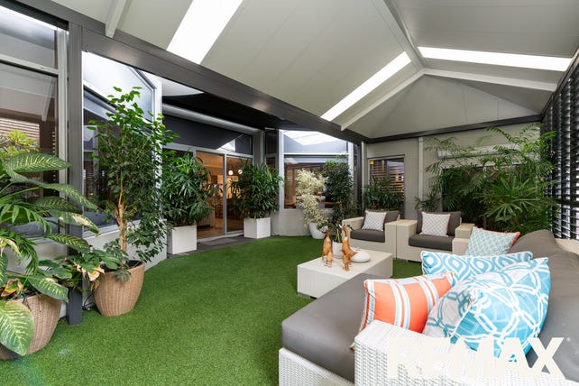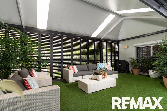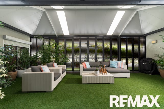 It's enclosed with bi-fold aluminum shutters to allow either privacy or open plan entertaining. A shade blind protects the space adjoining the house and it's all finished off by synthetic durable lawn.