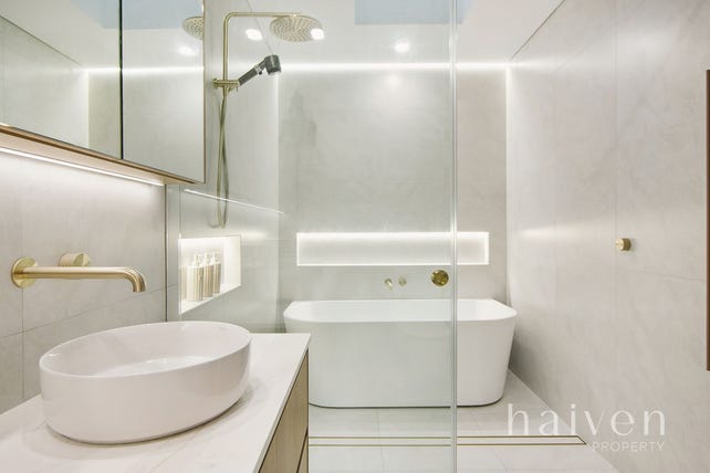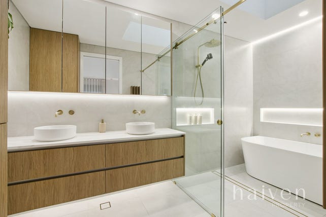 Upstairs, the sleeping quarters feature a built-in study nook with a desk and over-head storage, plus a full-height double-mirrored-sliding-door linen press. There are four Velux skylights for natural illumination – two of them found within an expansive master-bedroom suite with high raked ceilings, a fitted walk-in robe, custom bedside tables with charging points, a relaxing north-facing composite balcony deck and a spacious fully-tiled ensuite, comprising of a free-standing bathtub.
