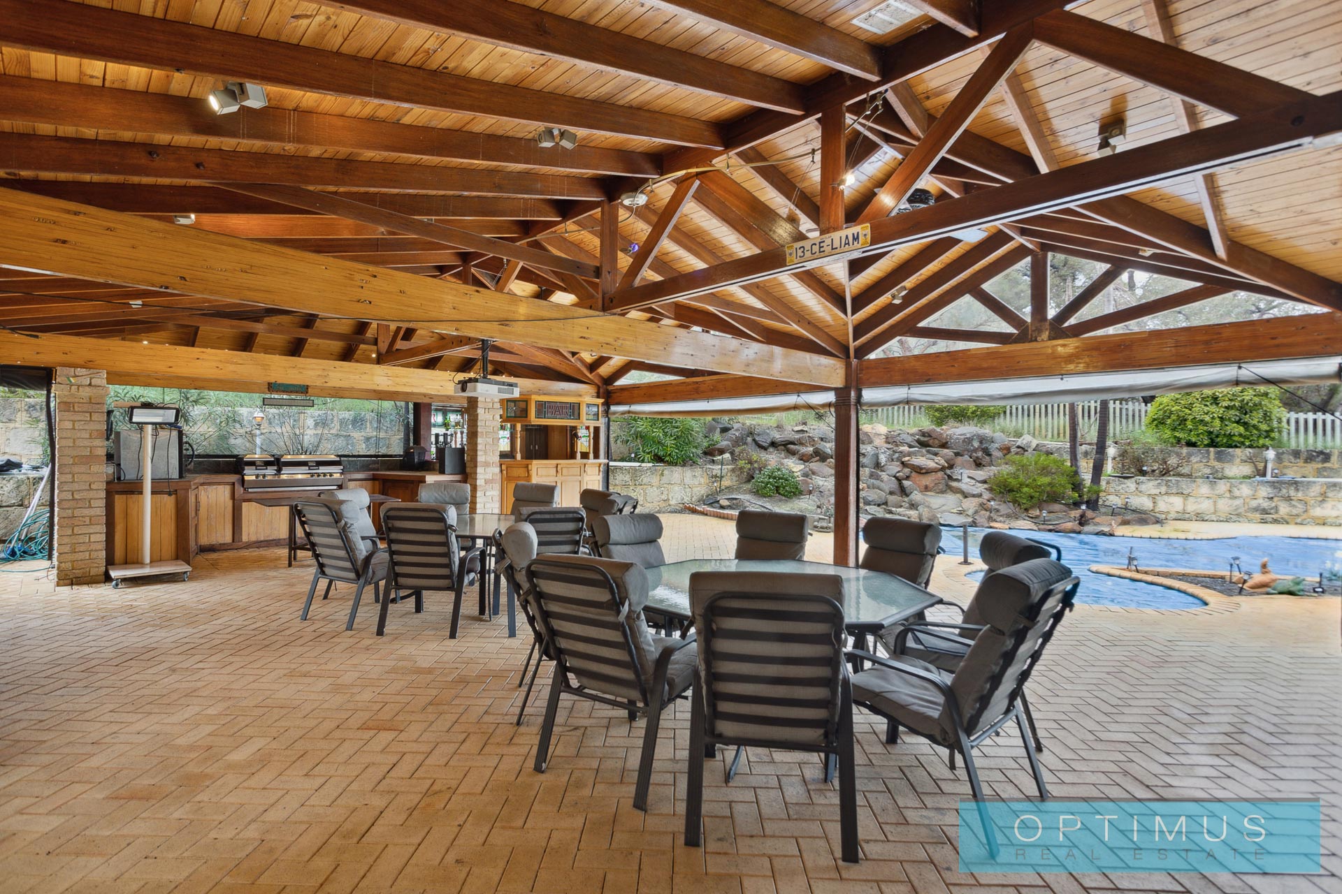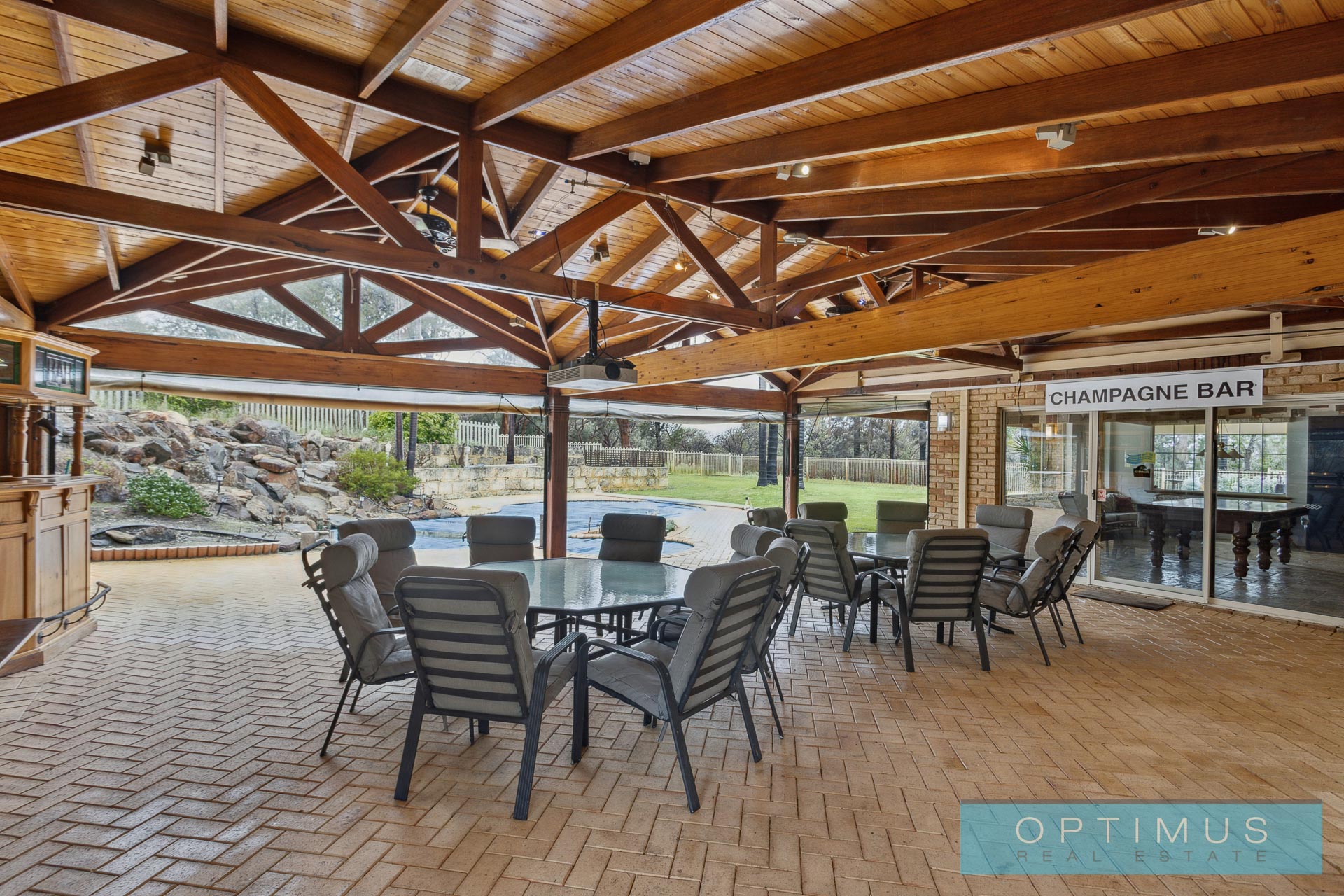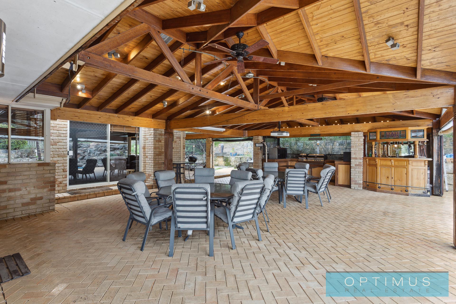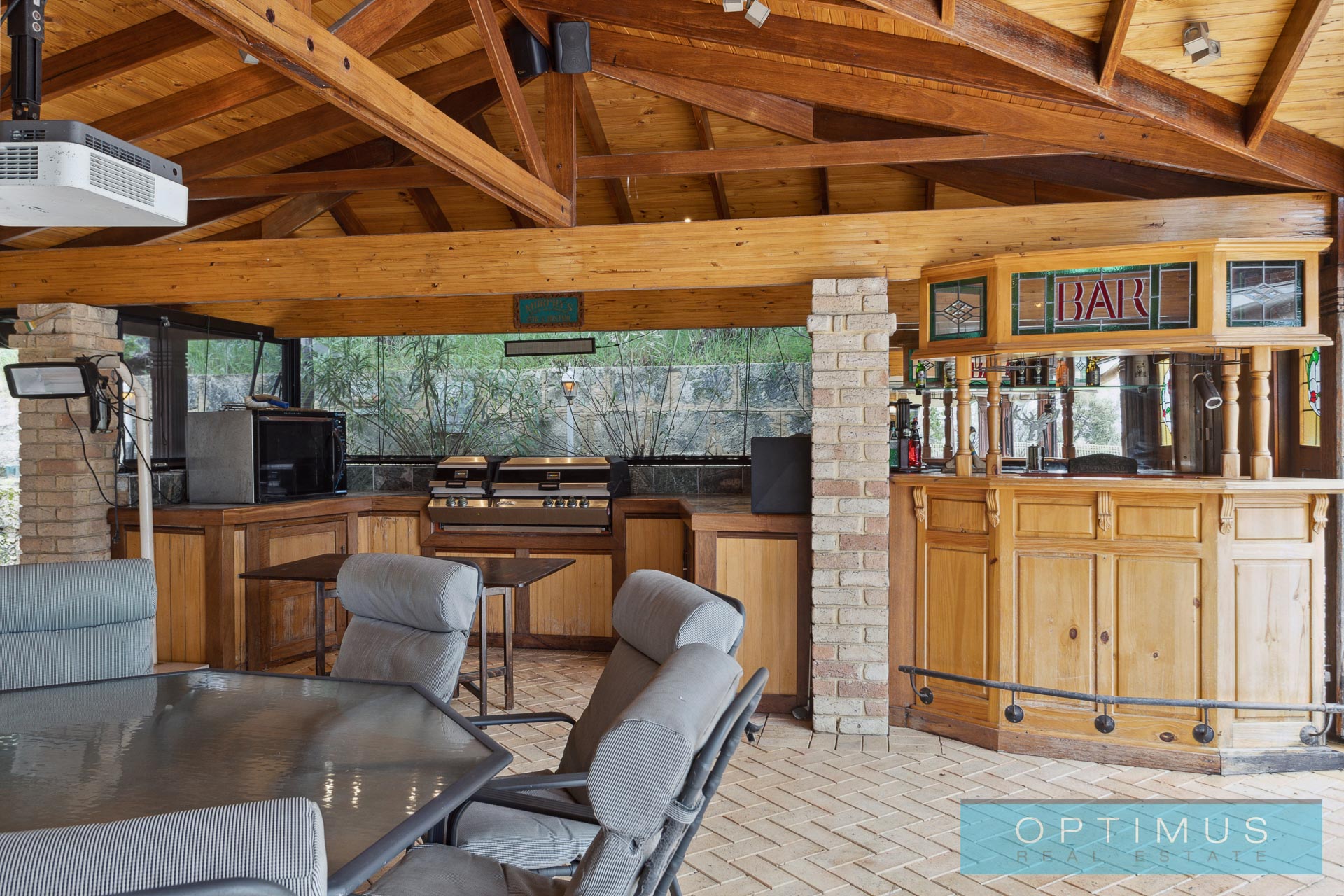A n IMPRESSIVE 120 sqm timber lined undercover patio overlooks pool with views to Darling Escarpment beyond, perfect for sundowner drinks.