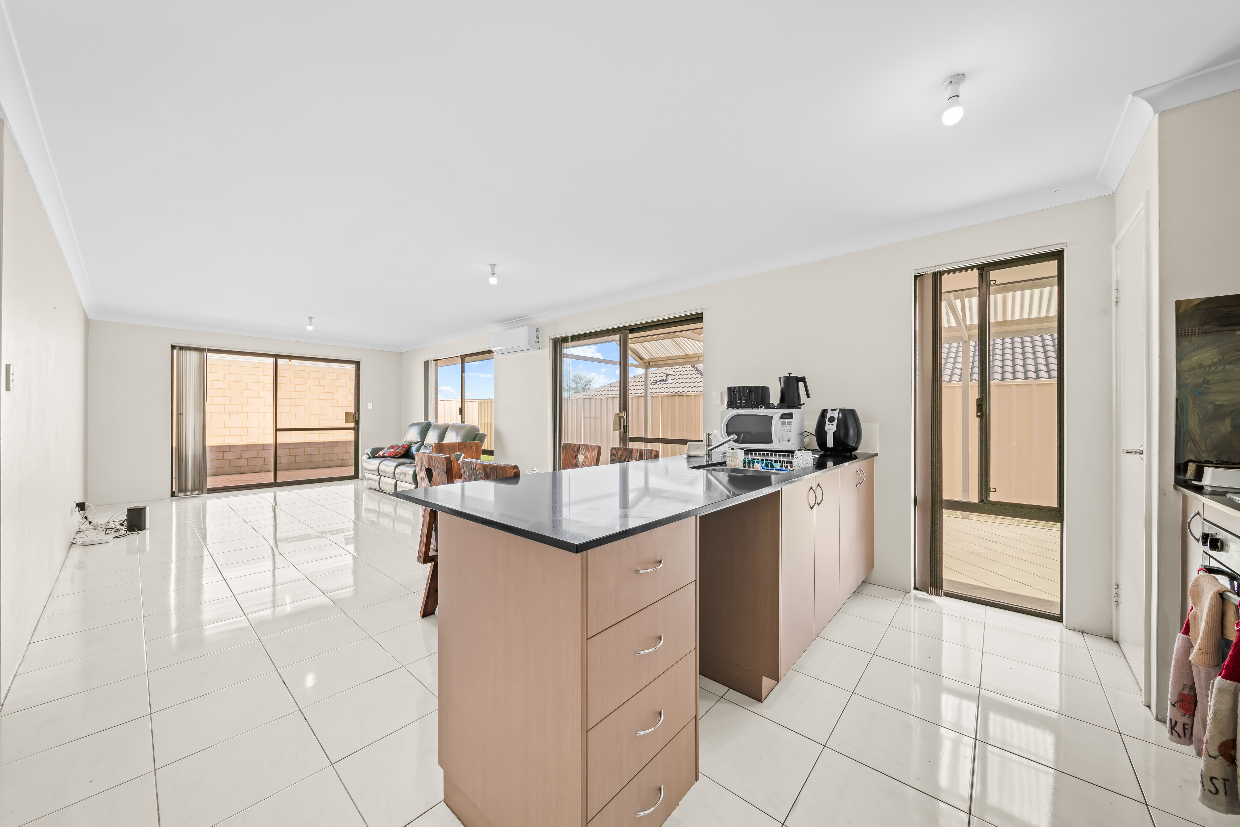 The kitchen is a culinary haven, boasting stone benchtops, stylish splashbacks, ample cupboard storage, and abundant bench space for culinary creations. The family and dining areas feature durable tiled flooring, enhanced by quality lighting and window treatments.