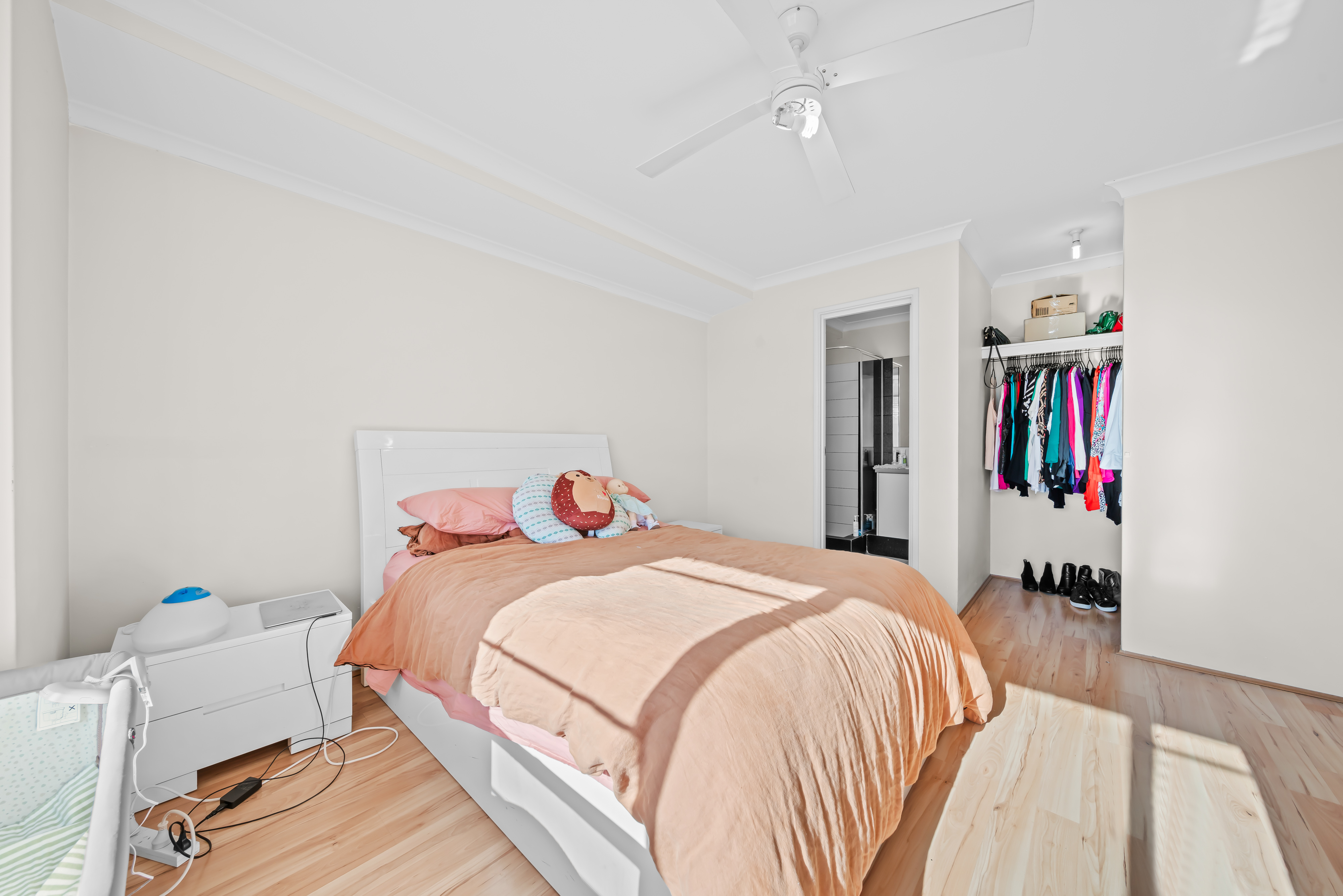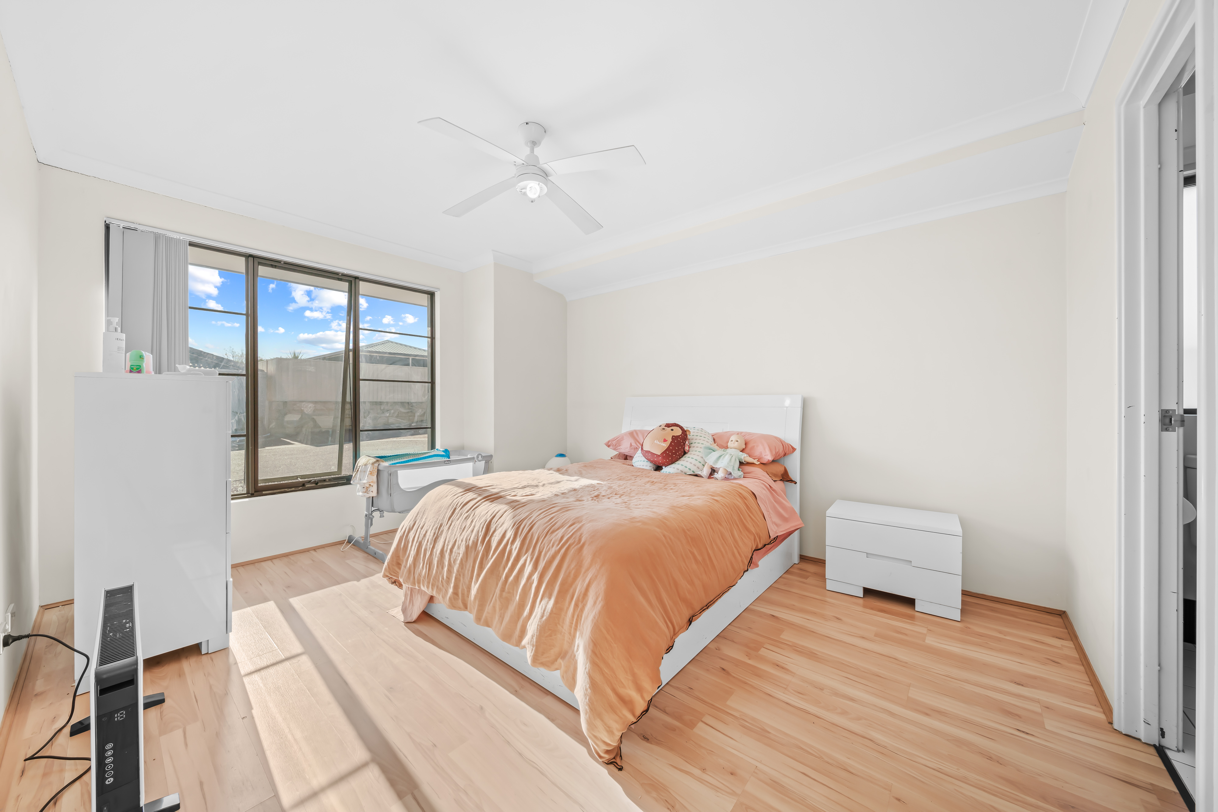 Upon entering, be greeted by the master bedroom and ensuite, exuding a sense of tranquility and refinement. The master bedroom boasts a generously sized walk-in robe and features sleek floating wood flooring, complemented by tasteful window treatments and lighting.