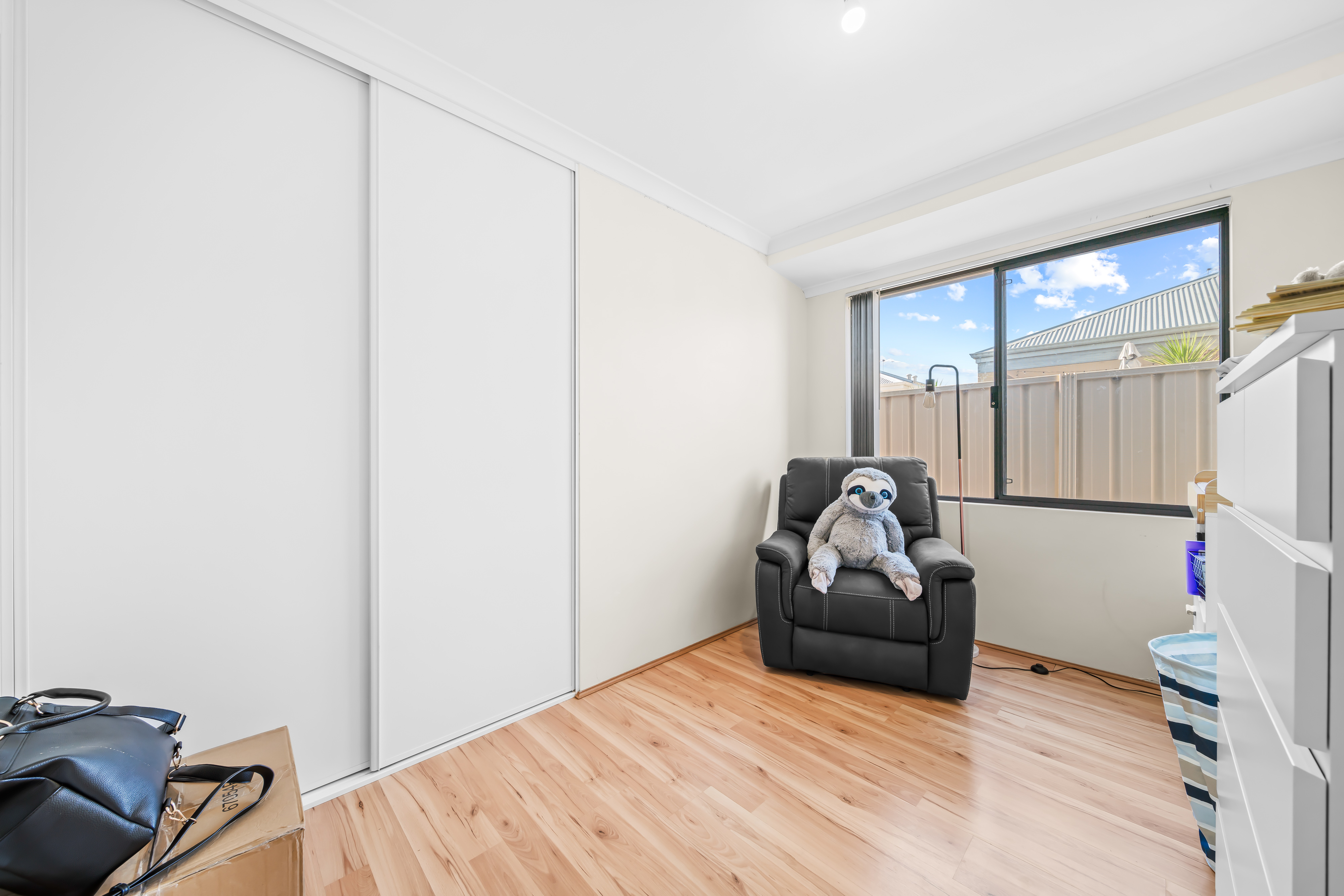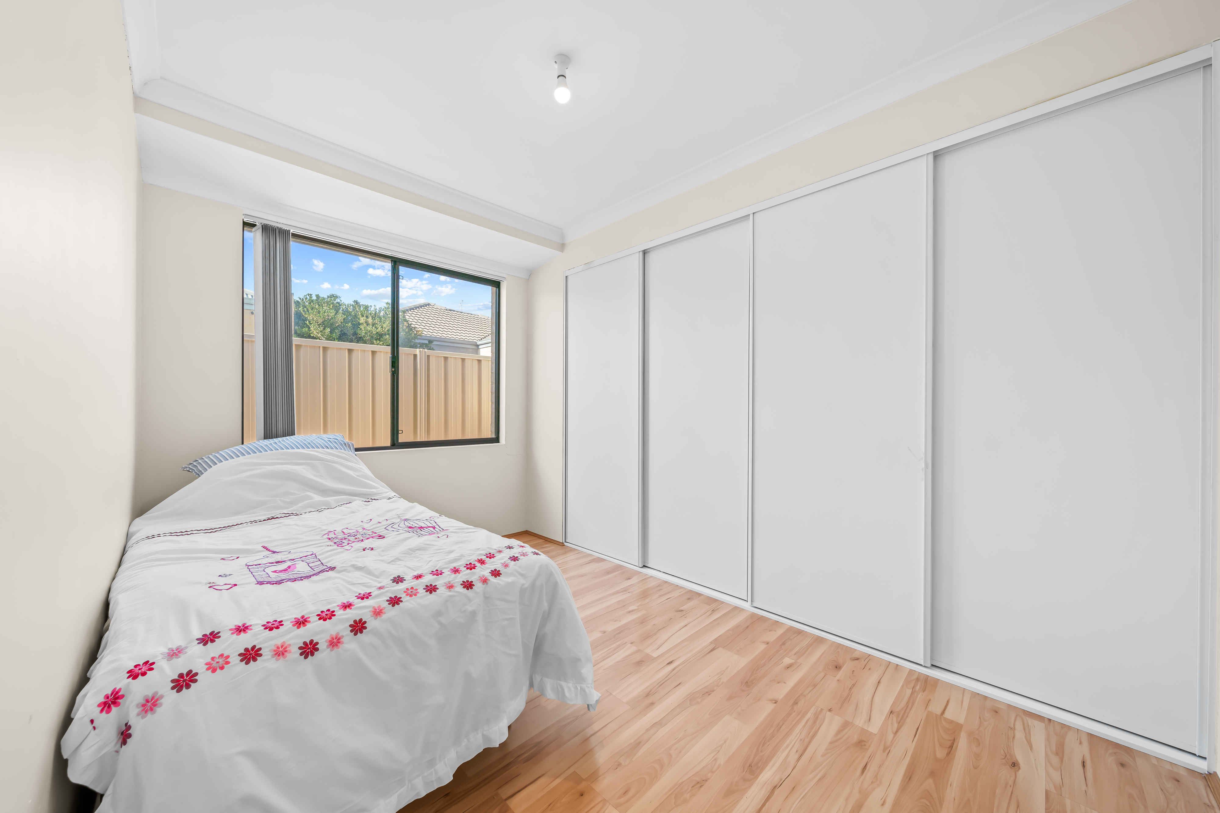 The minor bedrooms offer comfort and versatility, each adorned with floating wood flooring, sliding door robes, and the same attention to detail evident throughout the home.