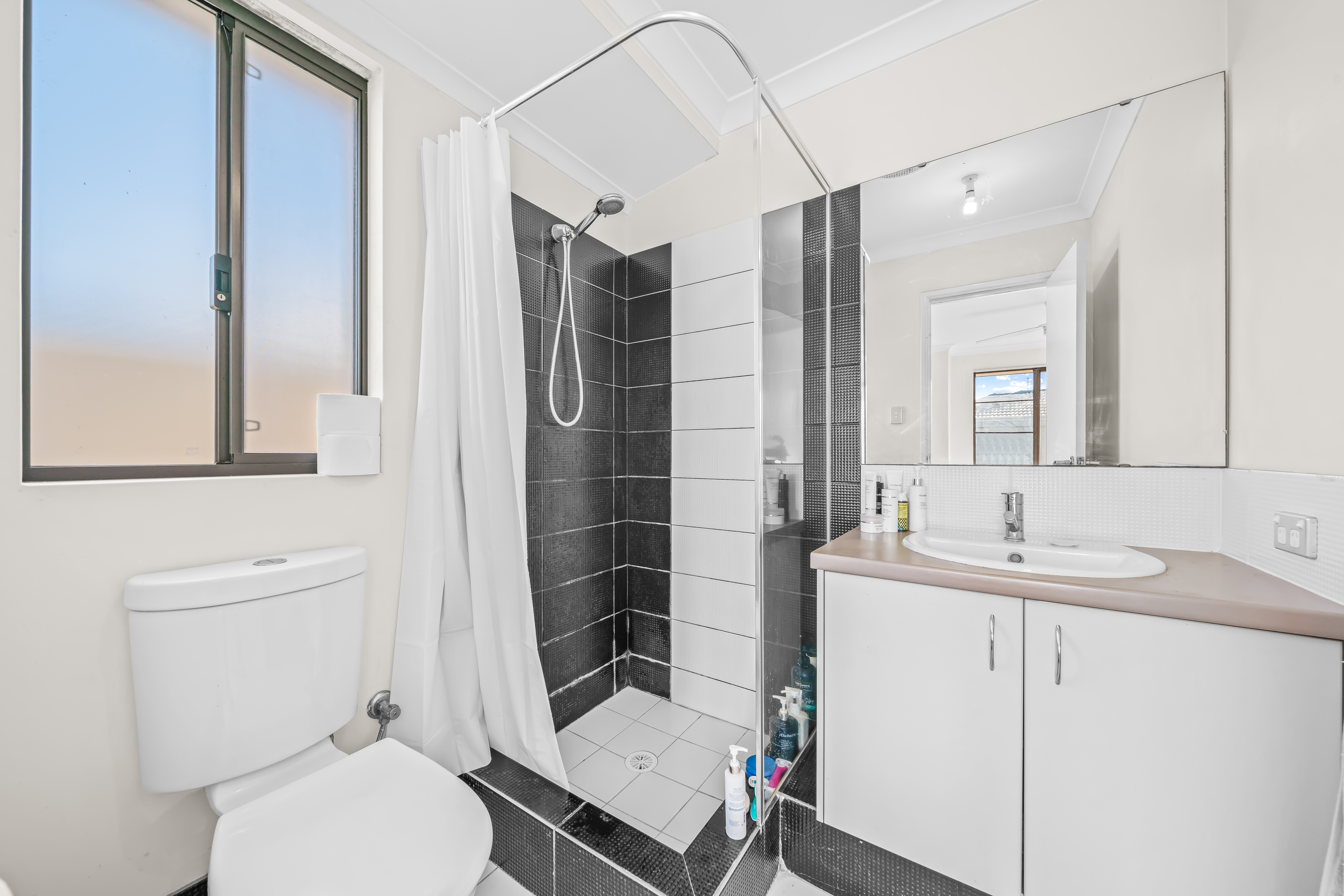 The ensuite is a sanctuary unto itself, adorned with tiled flooring, a spacious shower, single vanity, and premium fixtures. Quality lighting and window treatments add a touch of sophistication to this private retreat.