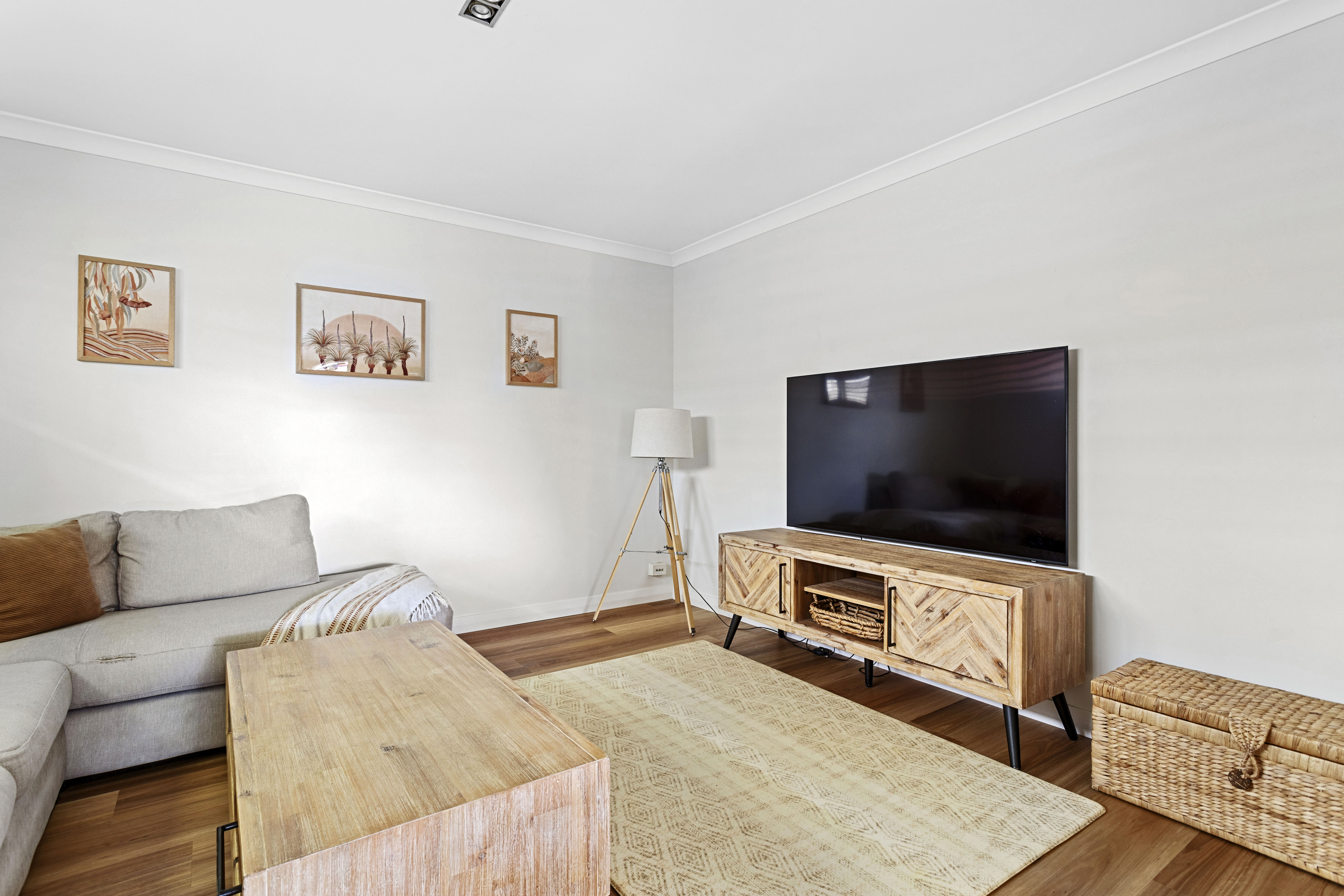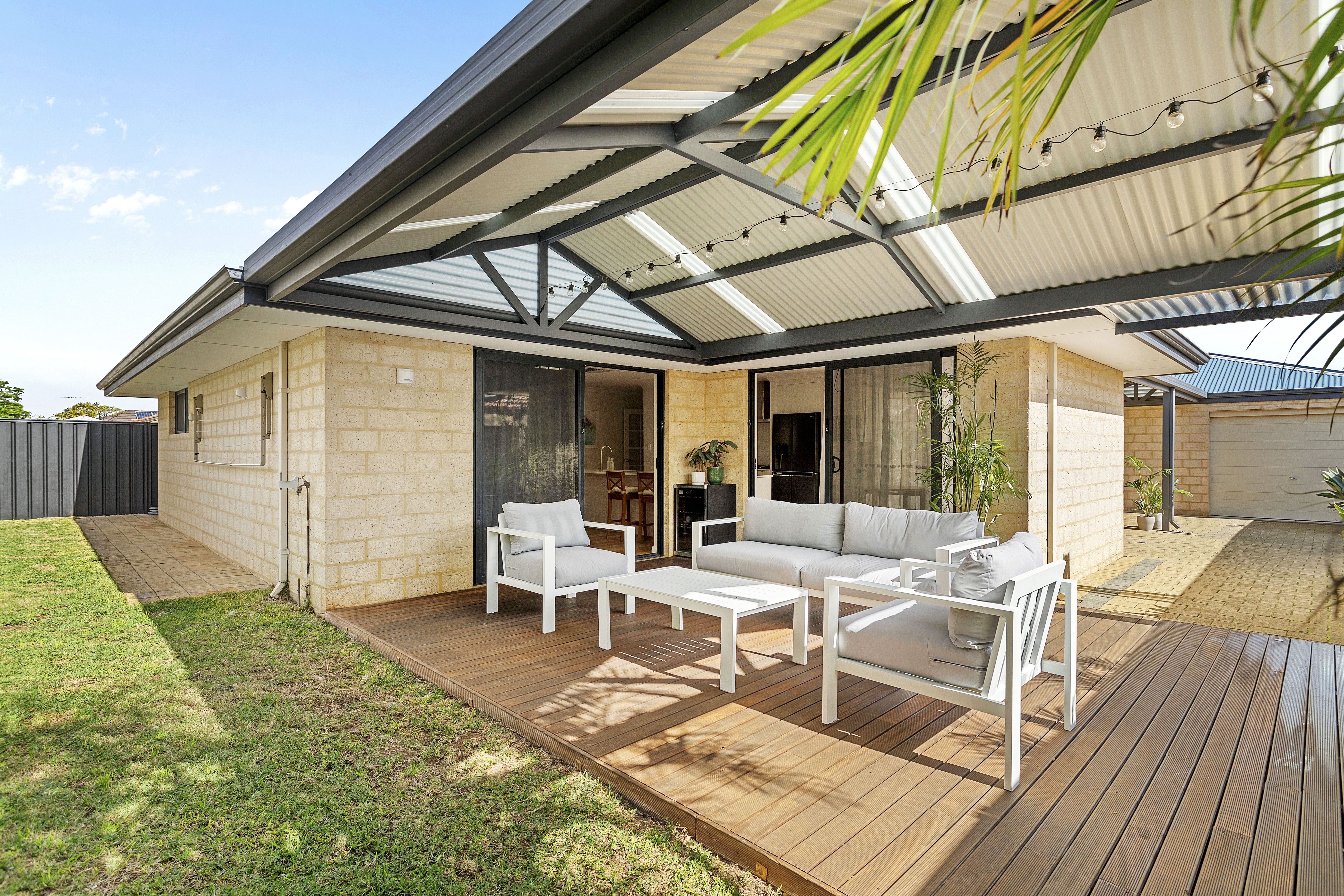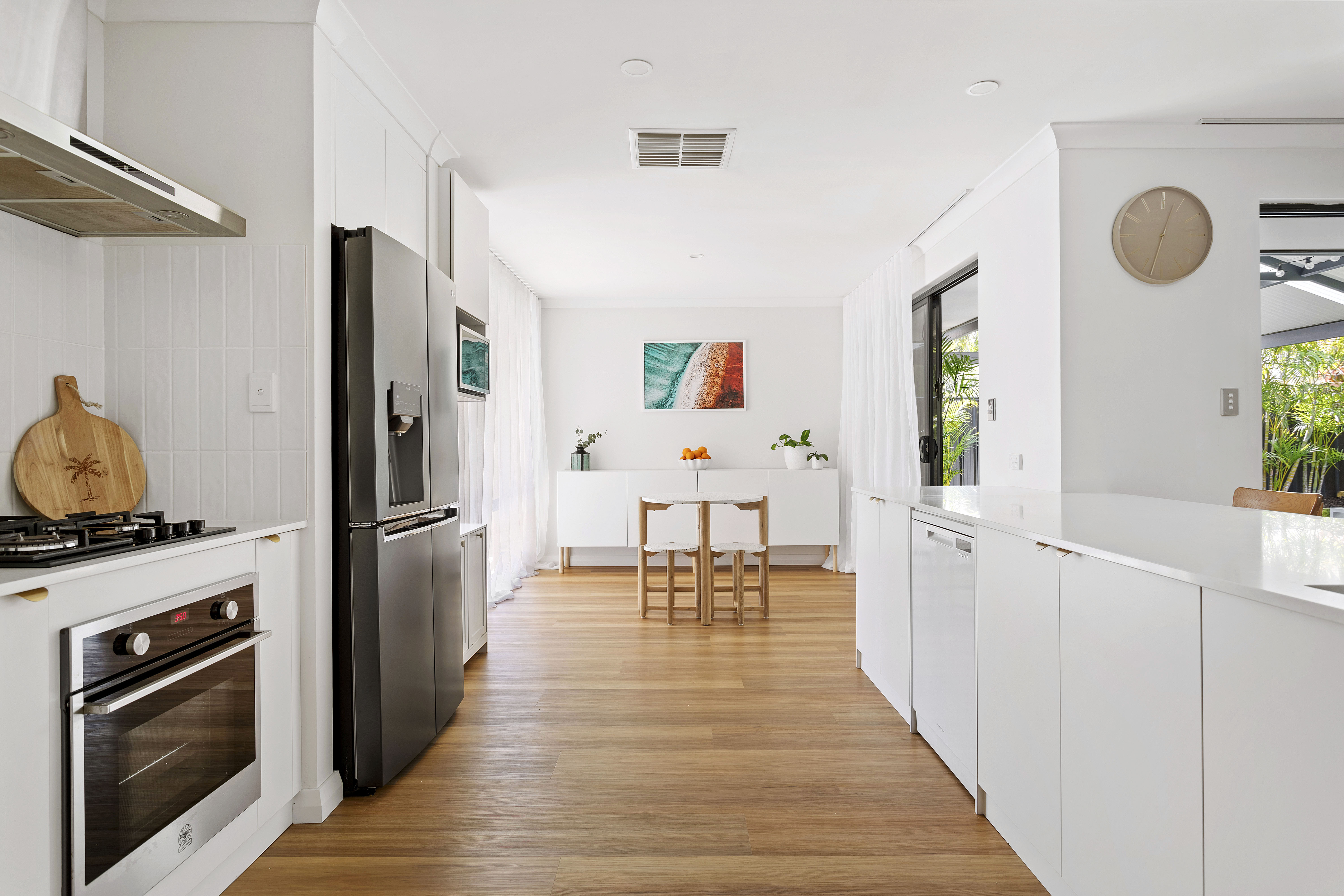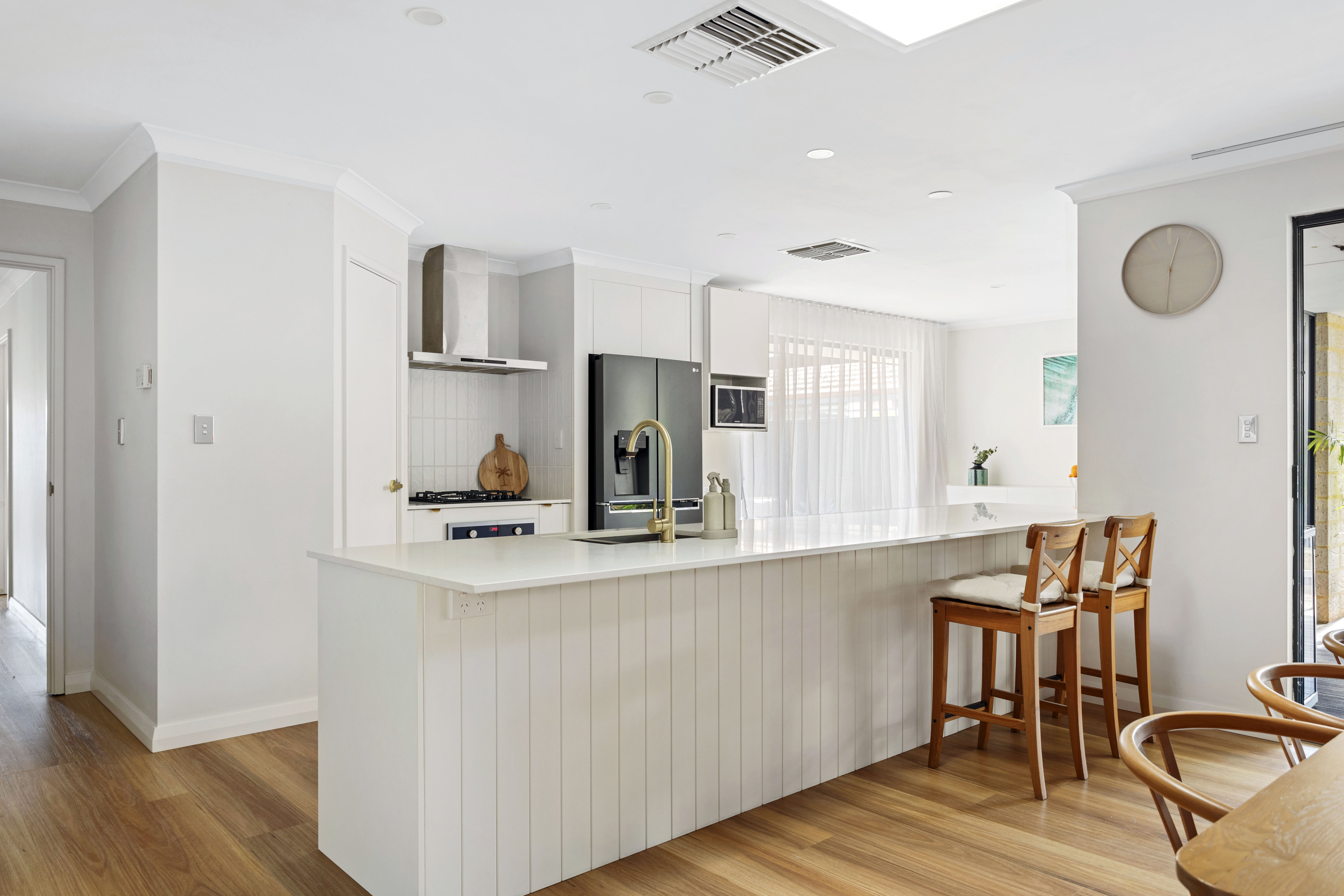 Inside, the kitchen is equipped with high-end appliances, an abundance of natural light, ample cabinet space, and views looking out to the undercover alfresco. The adjoining living area, also overlooking the garden, creates a warm and inviting space perfect for relaxation or entertaining. The combination of stylish downlighting and a contemporary colour scheme enhances the home's cozy and welcoming atmosphere.