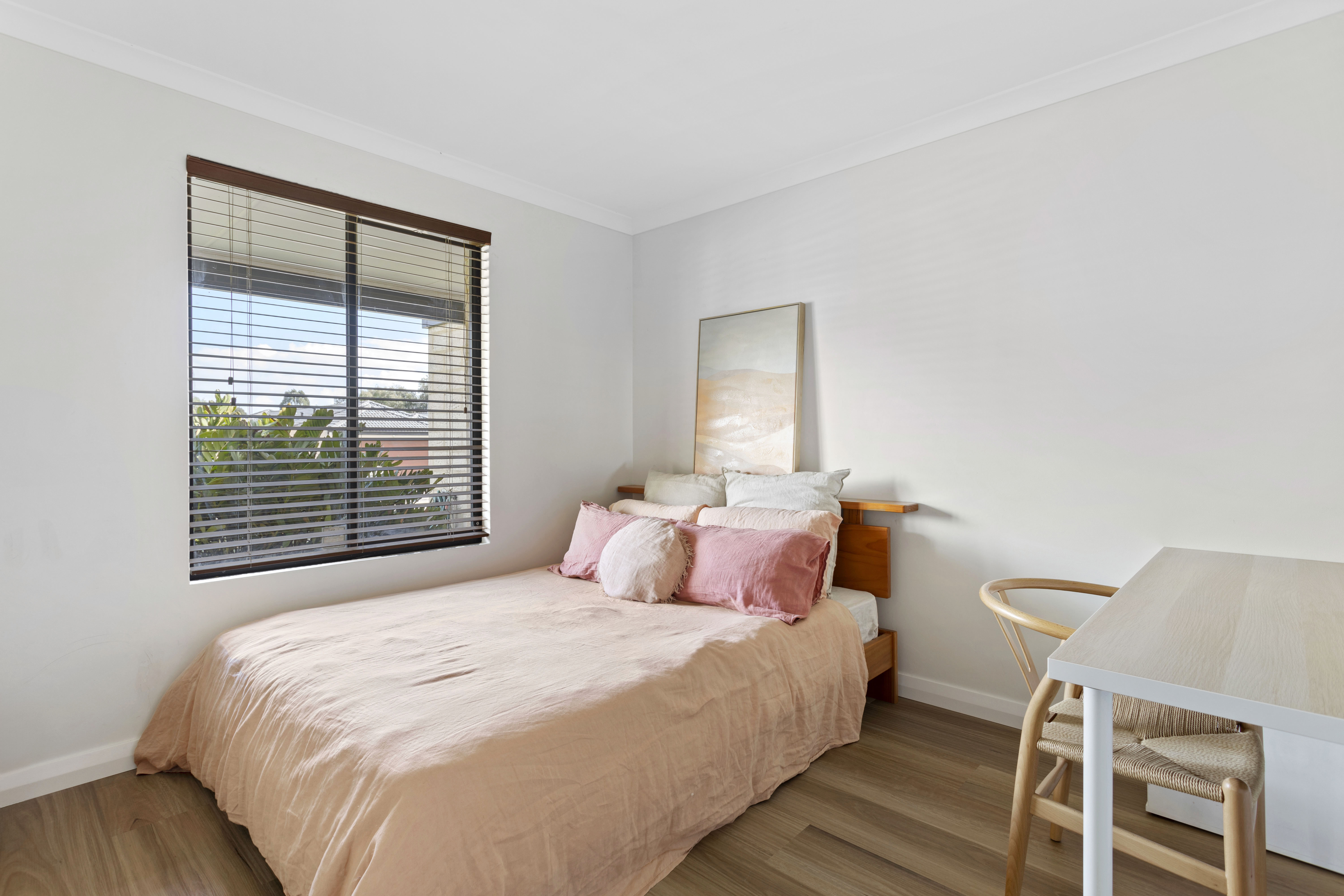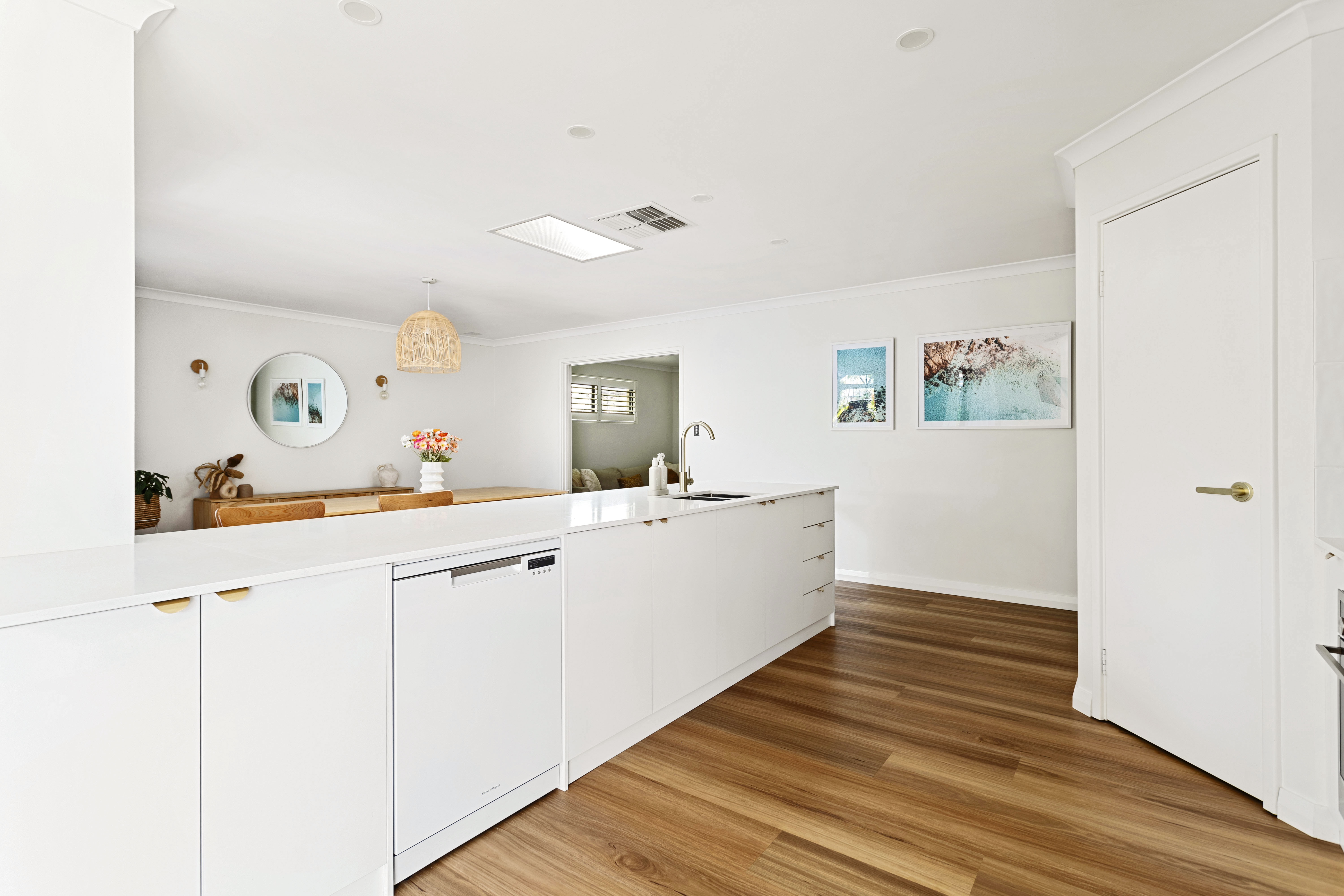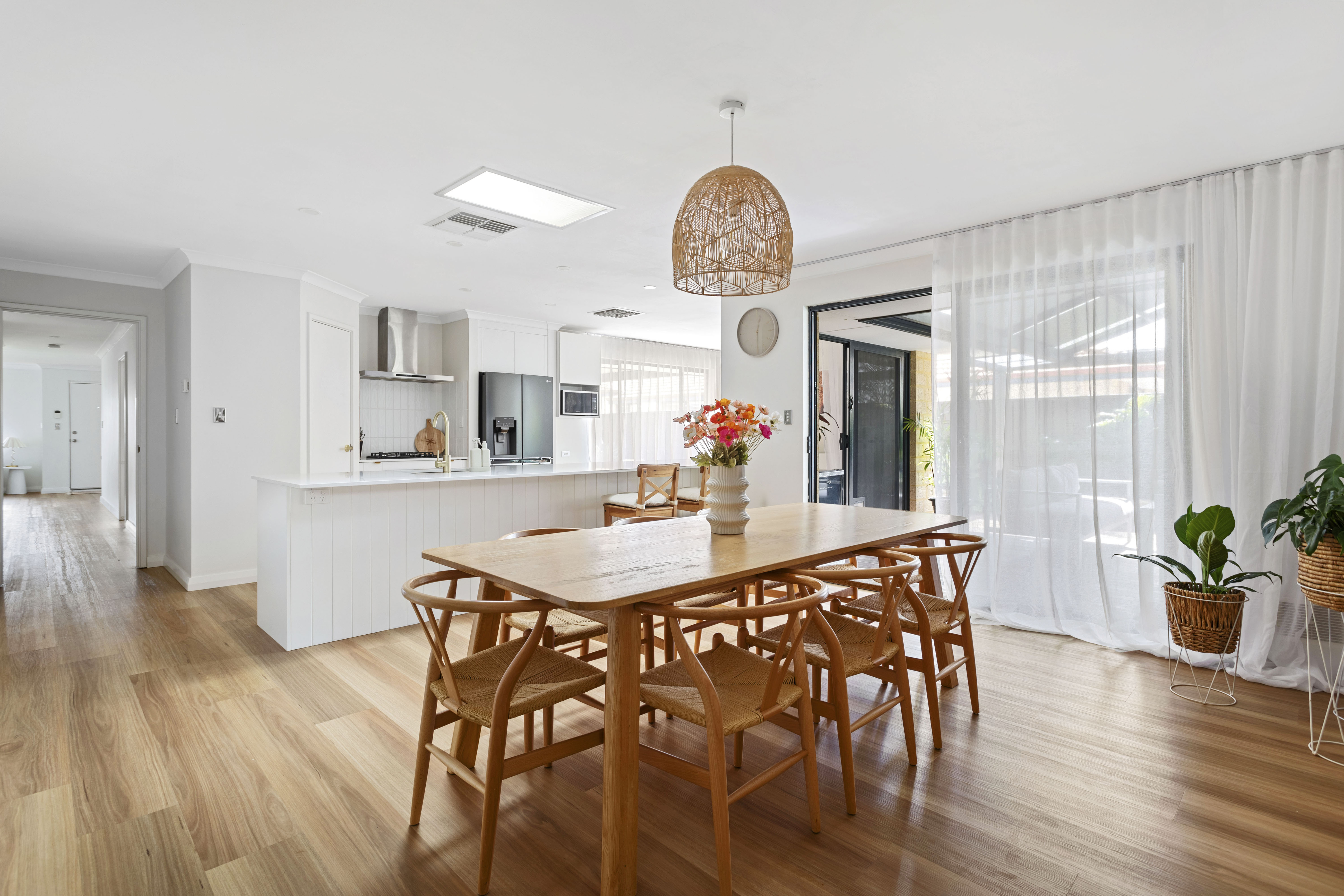 Inside, the kitchen is equipped with high-end appliances, an abundance of natural light, ample cabinet space, and views looking out to the undercover alfresco. The adjoining living area, also overlooking the garden, creates a warm and inviting space perfect for relaxation or entertaining. The combination of stylish downlighting and a contemporary colour scheme enhances the home's cozy and welcoming atmosphere.