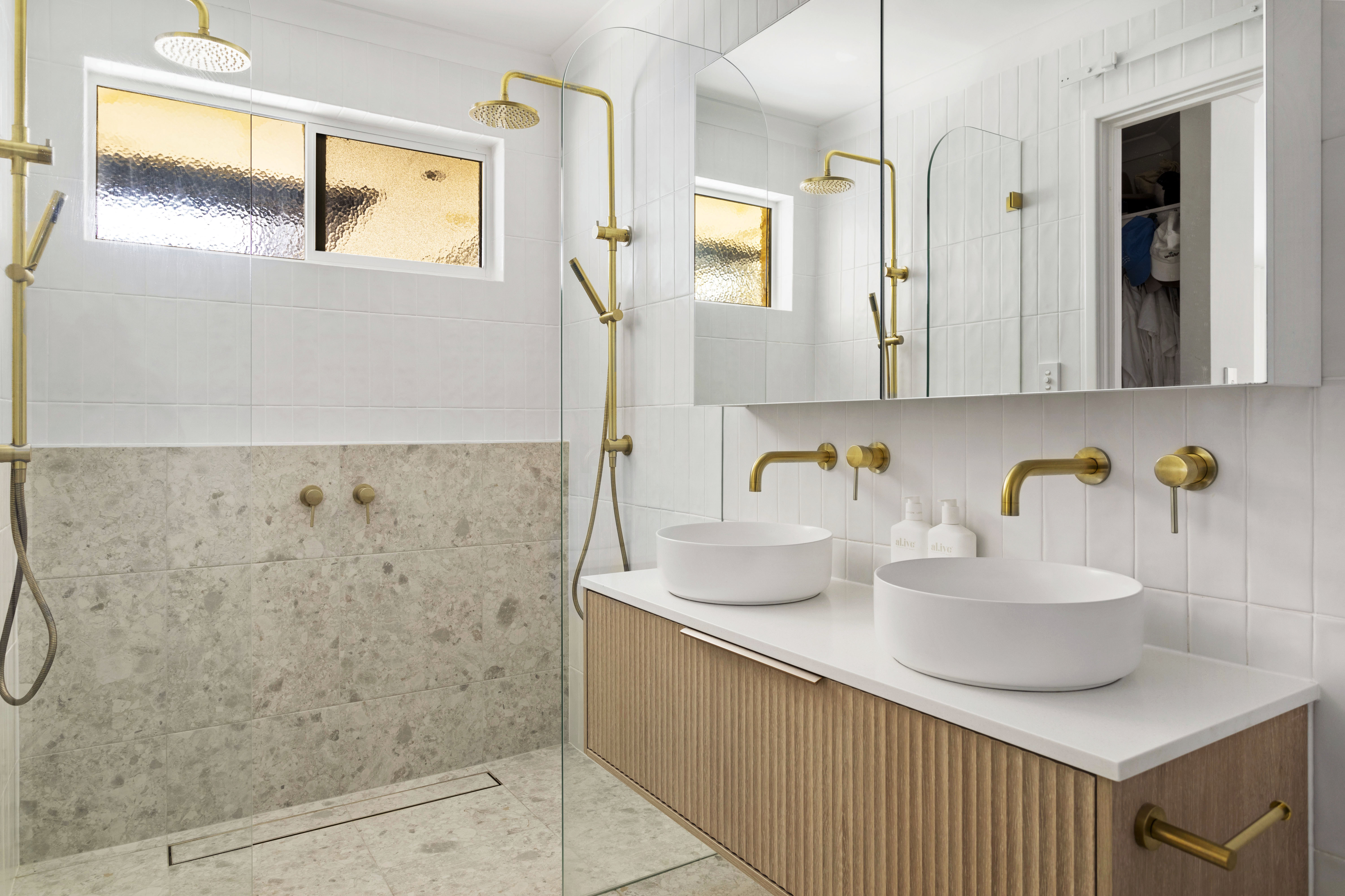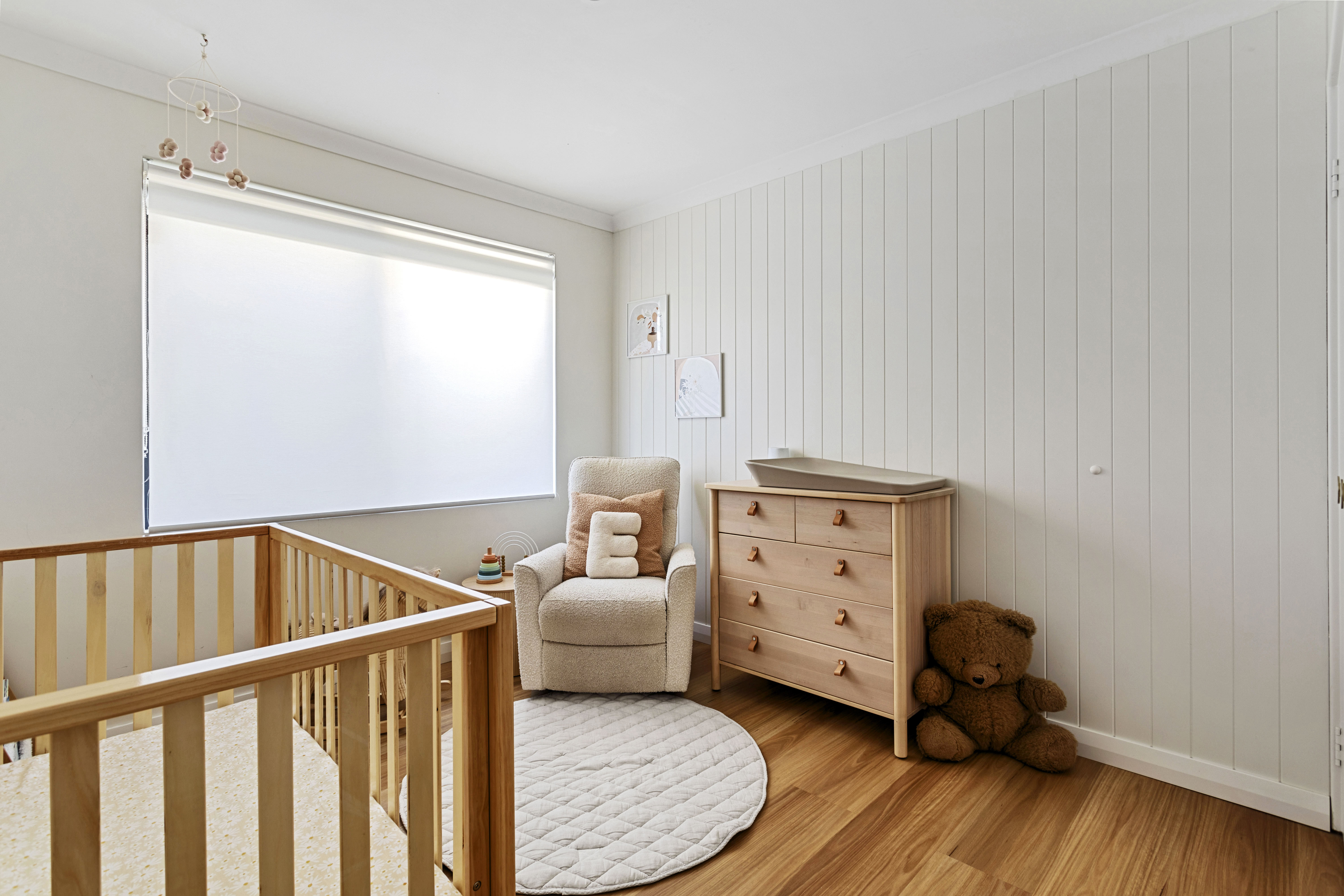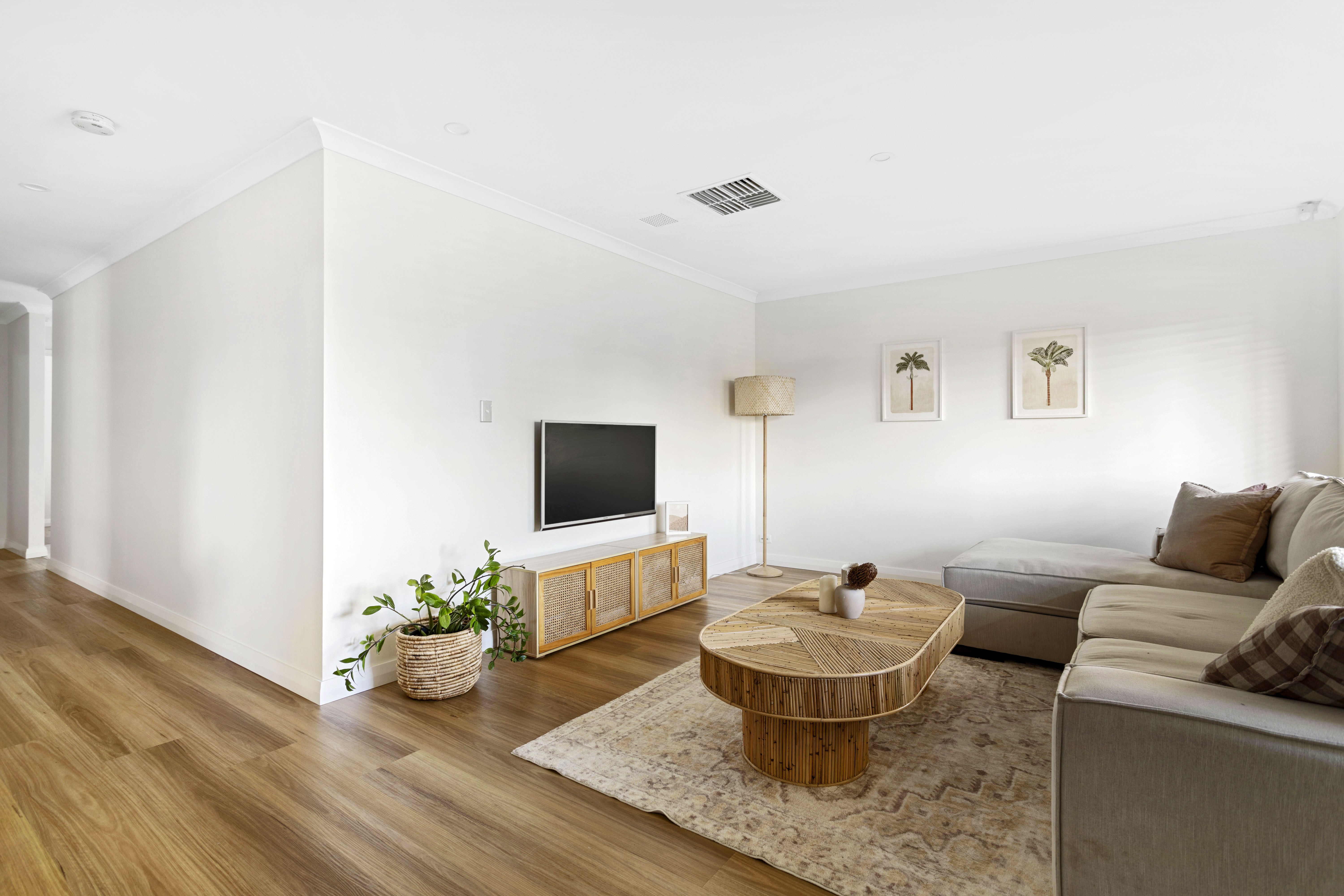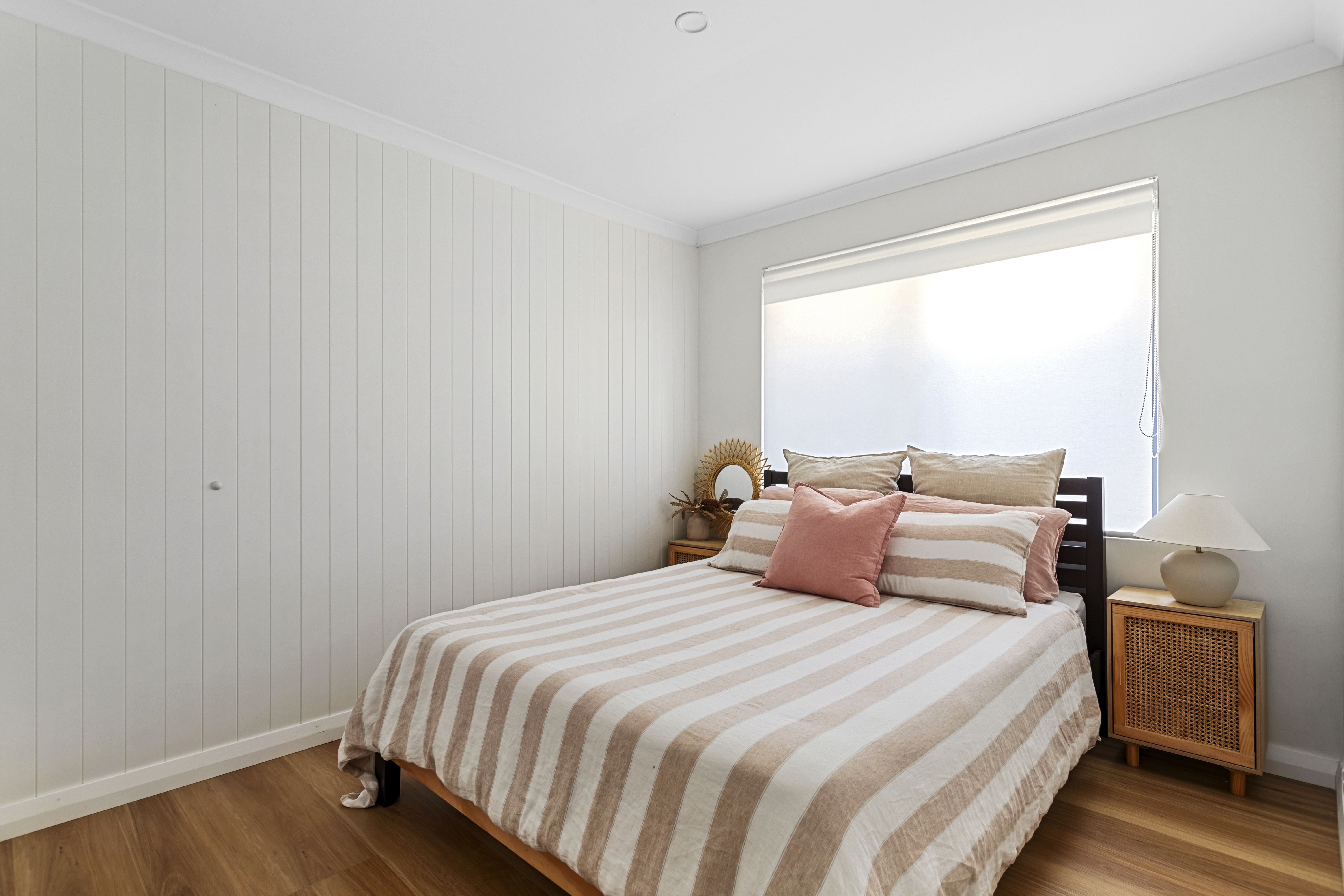 Inside, the kitchen is equipped with high-end appliances, an abundance of natural light, ample cabinet space, and views looking out to the undercover alfresco. The adjoining living area, also overlooking the garden, creates a warm and inviting space perfect for relaxation or entertaining. The combination of stylish downlighting and a contemporary colour scheme enhances the home's cozy and welcoming atmosphere.