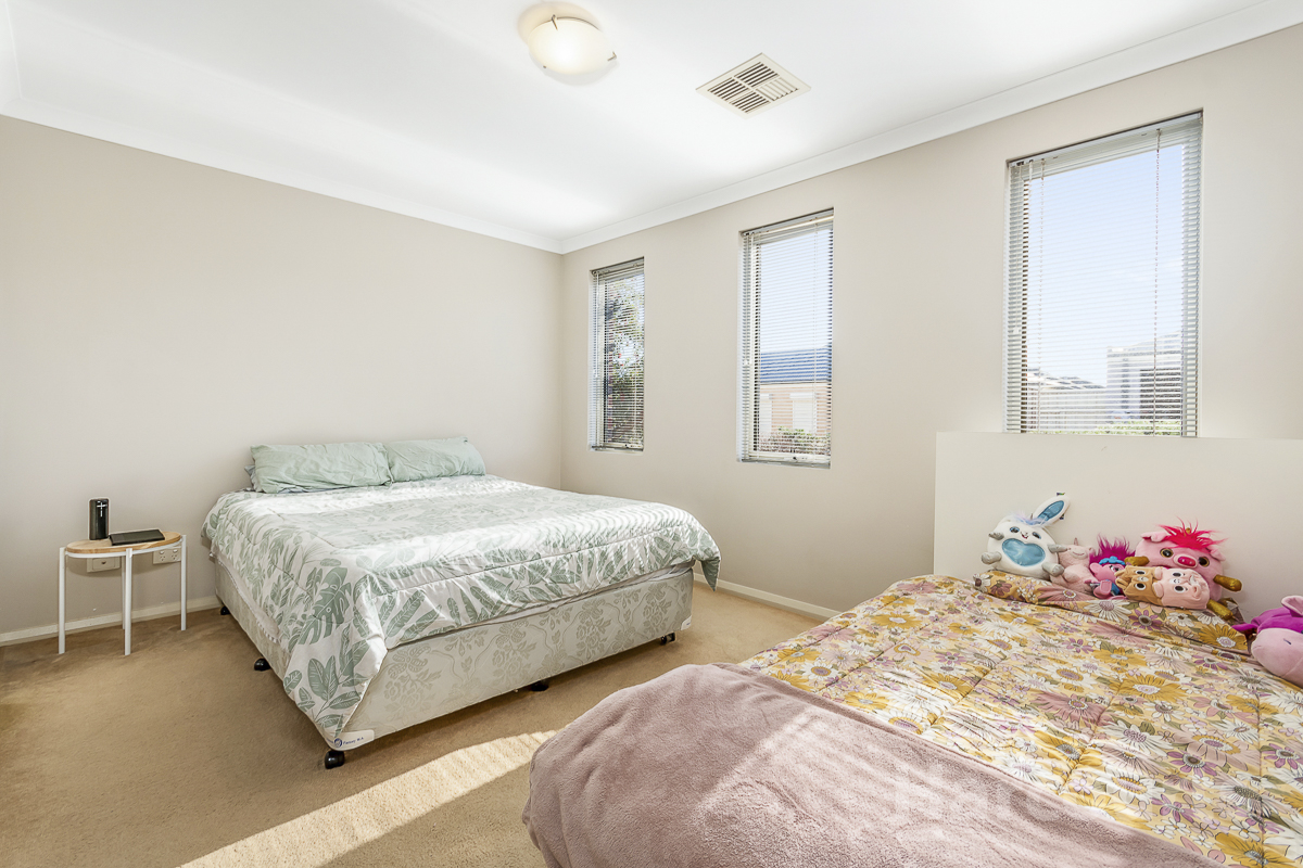 The additional two bedrooms do not skimp on space either, comfortably fitting queen-sized beds and featuring mirrored sliding door robes, epitomising the thoughtful design that runs throughout. The main bathroom serves these rooms, offering a convenient shower/bath combination, perfect for relaxing or catering to family needs.