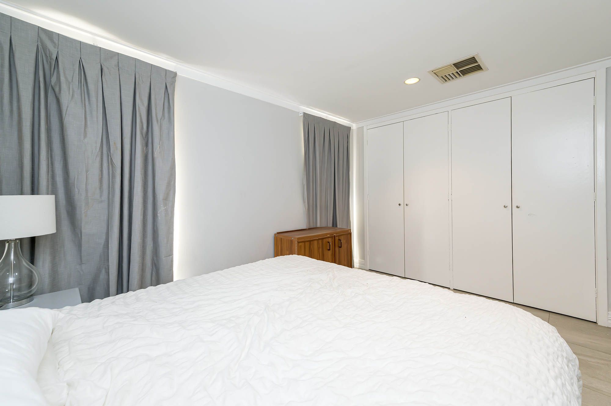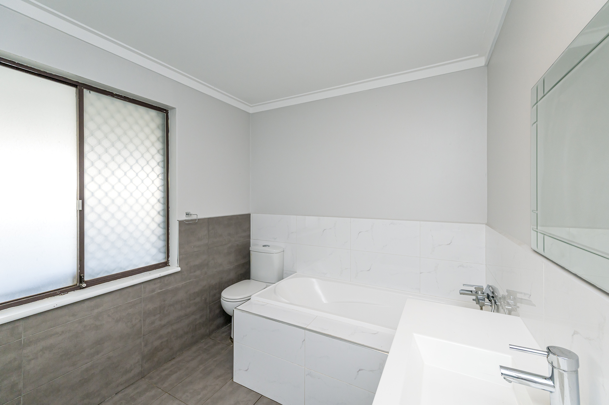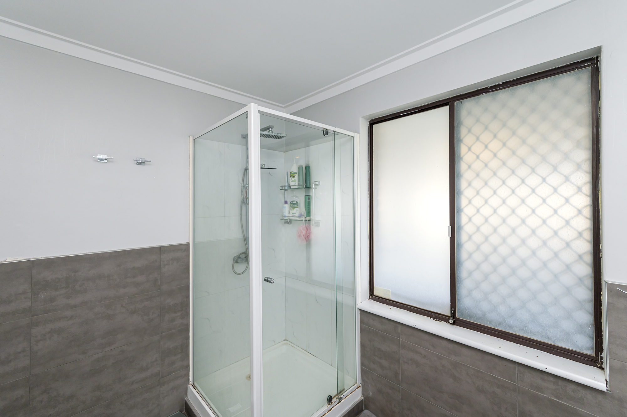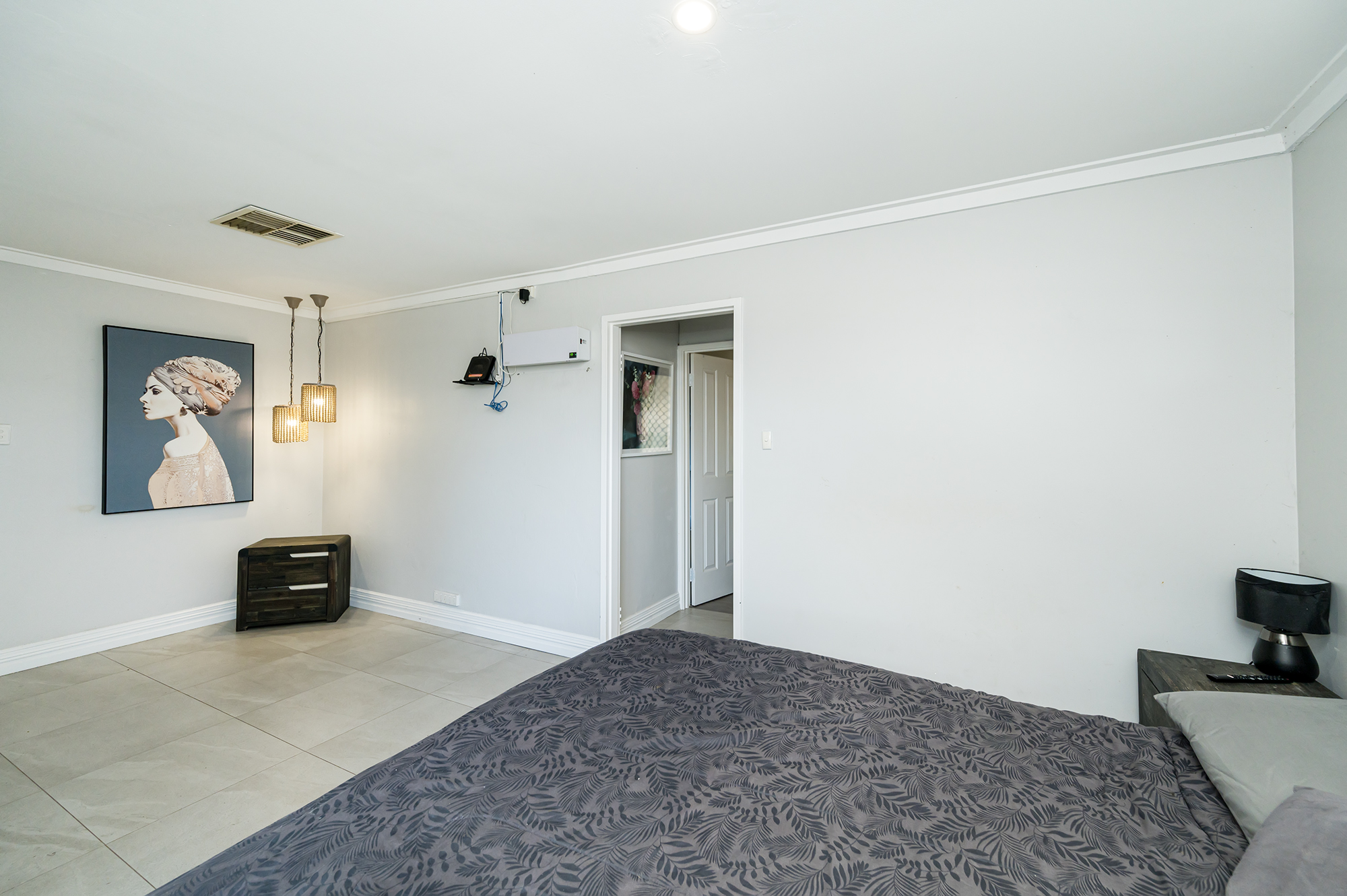 Sleek modern bathroom with floor to ceiling tiles, walk in glass shower, skylight Main bedroom features split system air-conditioning, built in robes, ensuite with bath