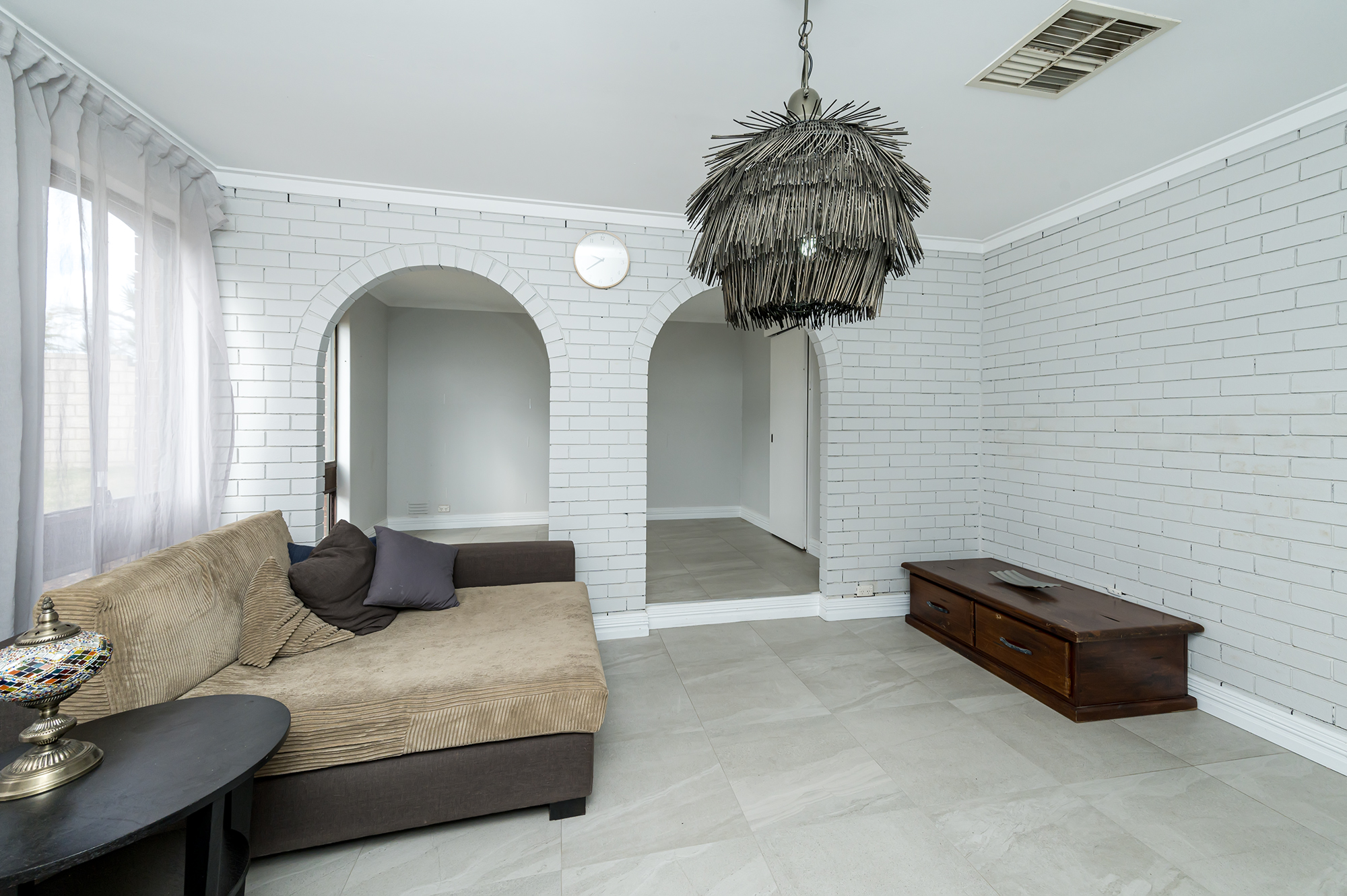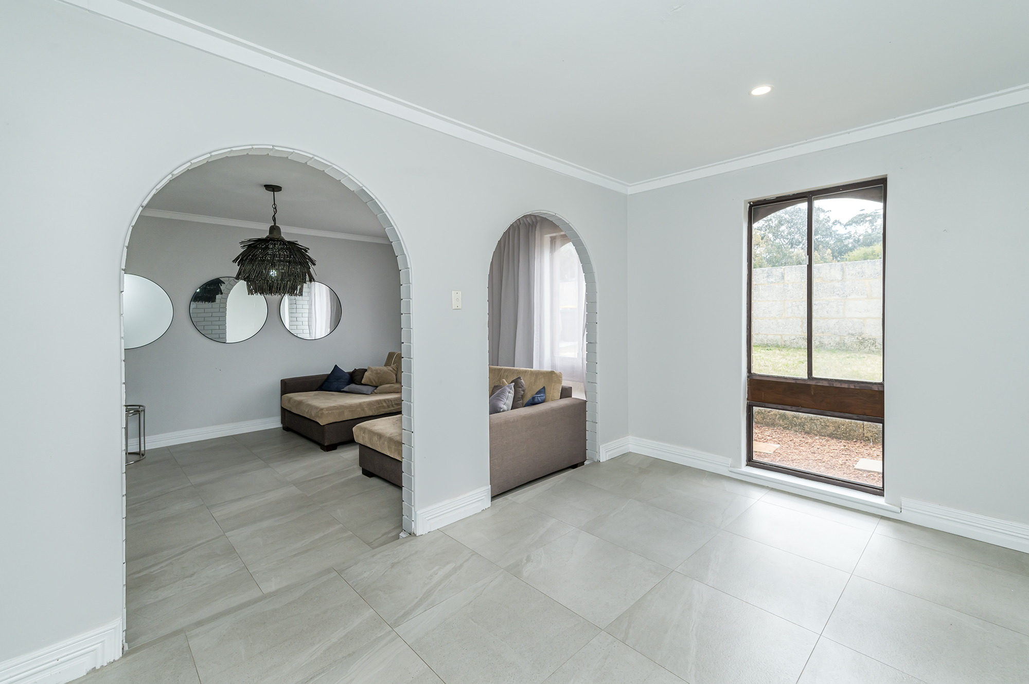 Large living room with tiled flooring