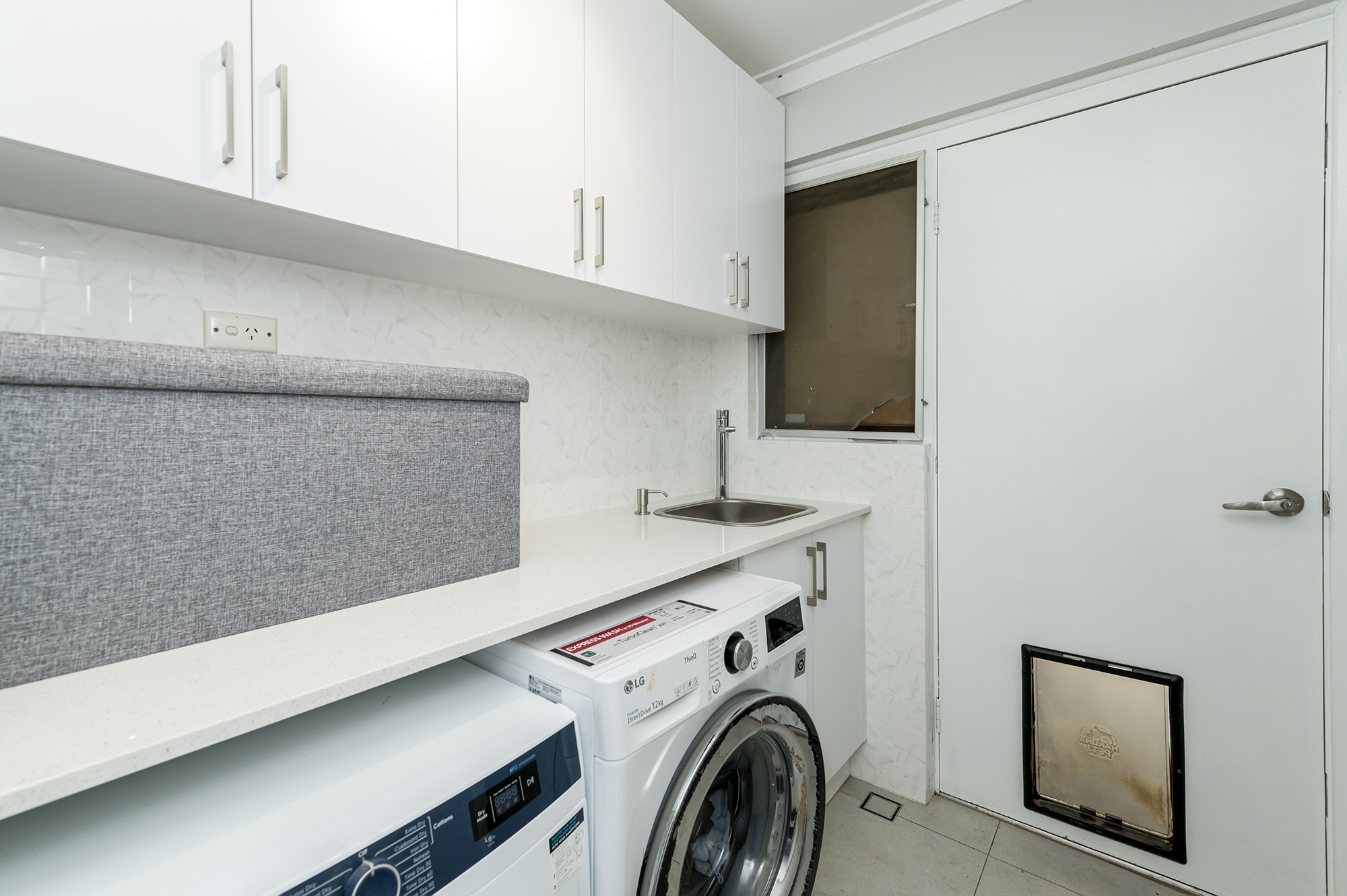 Outdoor spa Separate laundry with overhead cupboards Limestone wall at front of home