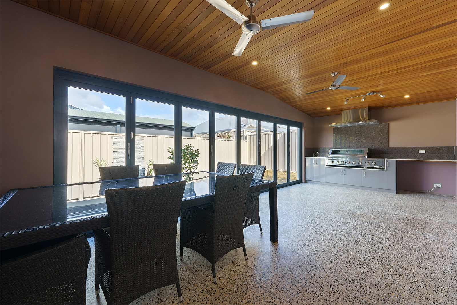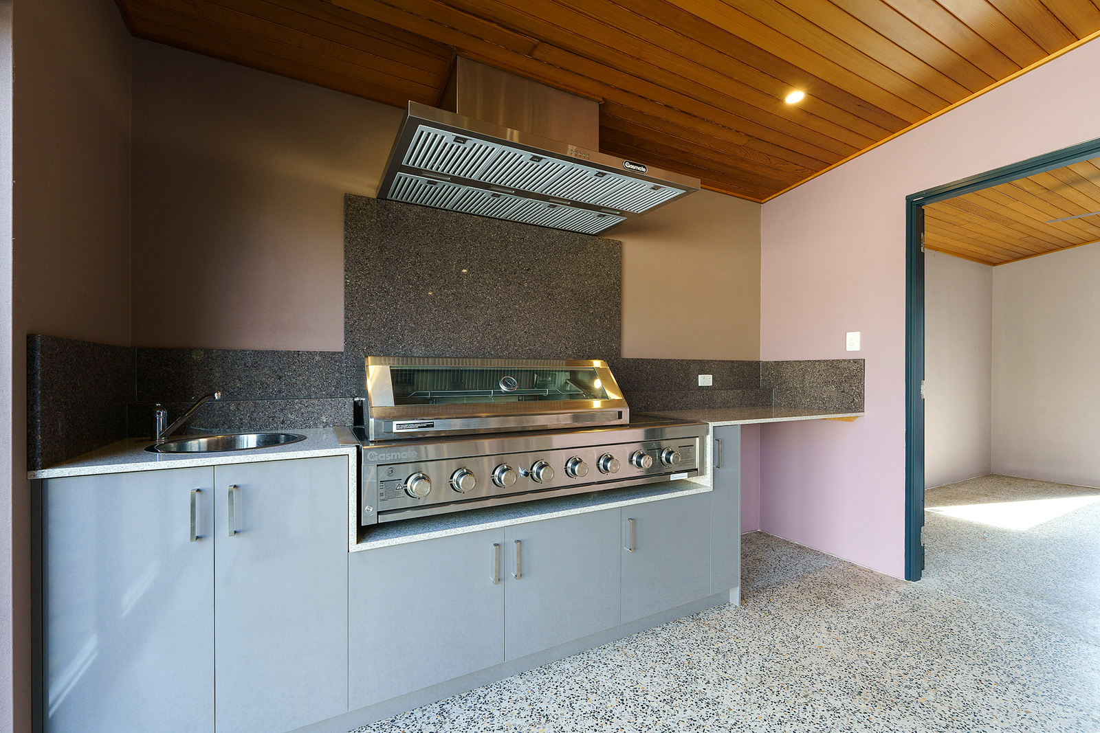 Enjoy indoor-outdoor entertaining within a giant enclosed sunroom that has its own built-in kitchen with stone bench tops, a circular sink, a stainless-steel Gasmate range hood and a stunning stainless-steel barbecue of the same brand. Double doors from here connect to another multi-purpose “alfresco” that can be whatever you want it to be, with bi-fold doors flowing out to the back garden.