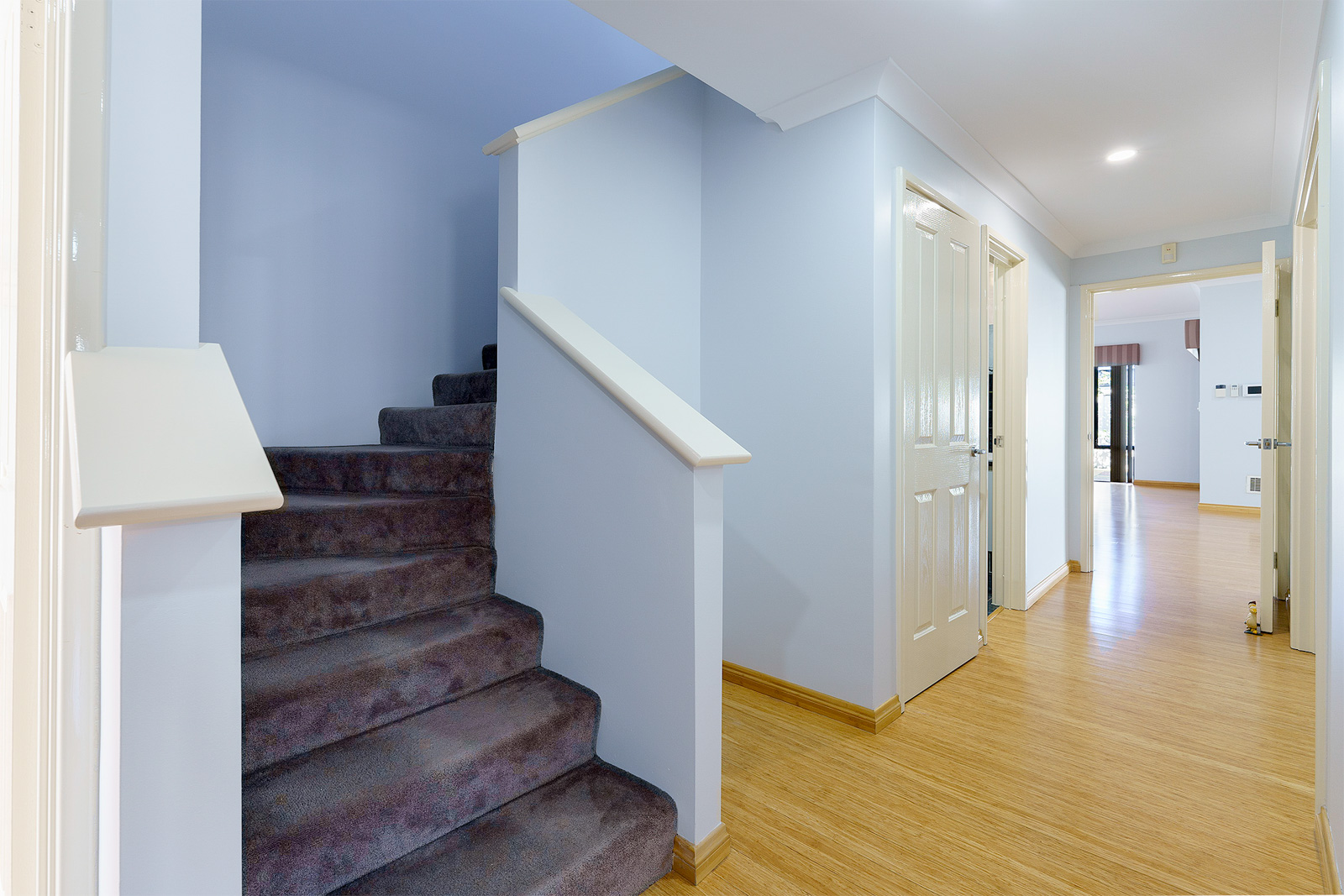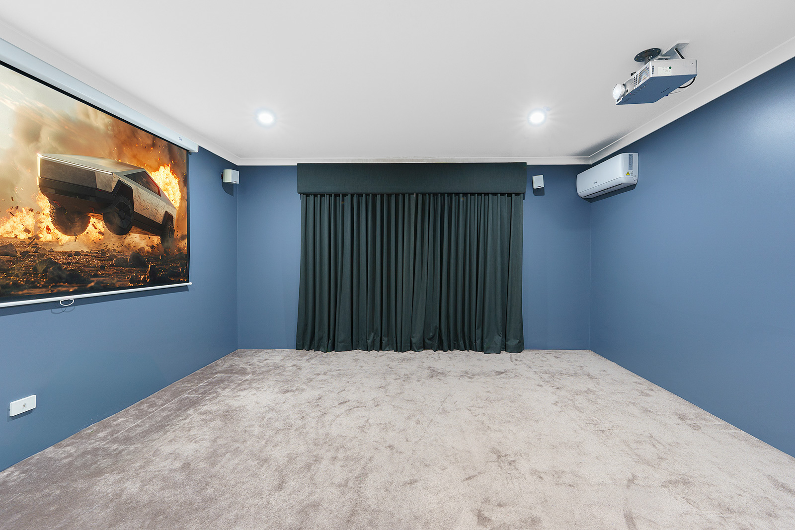 Off the double-door entry foyer lies the home office, directly opposite a commodious front master-bedroom suite with a walk-in wardrobe and an intimate ensuite bathroom – complete with a vanity, shower and toilet. Down the hallway, double doors reveal a huge home theatre room with a projector and screen for the ultimate cinema-style experience, adjacent to a powder room and an under-stair storeroom.
